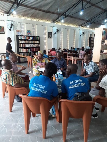 Réunion à l’Espace Volontaires de Brazzaville avec l’adjoint au Maire de Kintele et Mamadou, représentant France volontaires Congo / RDC.