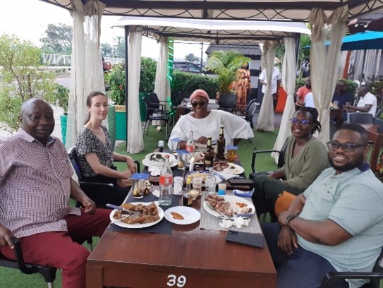 Déjeuner avec nos volontaires AEDH et ESSOR à Brazzaville (de gauche à droite : Théoneste, Léana, Martine et Rosalie).